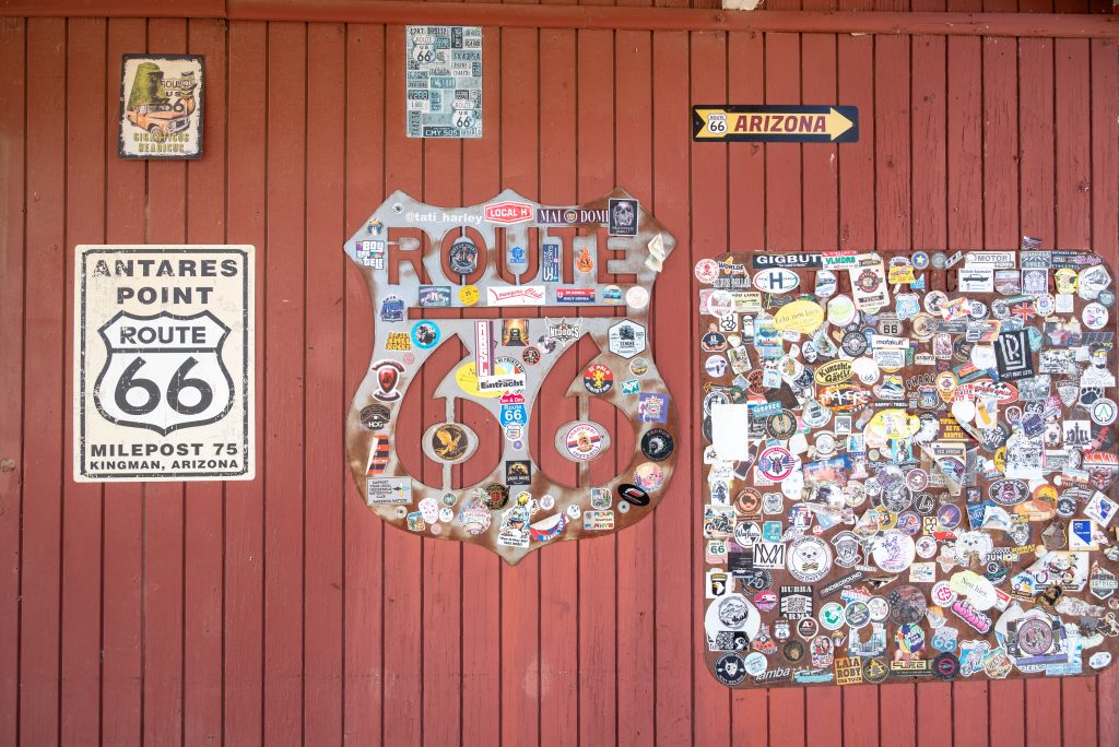 Whilst we had a taster in Winslow, one of the longest remaining stretches is the 88 mile (140 km) loop north from Seligman, a town west of the city of Flagstaff, to Kingman which was to be our next overnight halt. There are a number of other sights off the route westward from Winslow but the drive to Kingman was, with stops to shop, buy gas, ingest caffeine and just gawp at the scenery and the denizens of the road, a near six hours. So we did not venture to Meteor Crater, Walnut Canyon National Monument, Sunset Crater Volcano National Monument or any other of several interesting sounding places along the way.