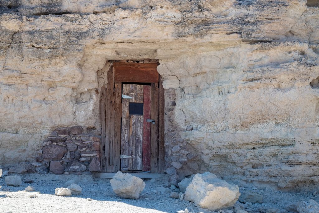 Leaving the Park in the other direction brought us a day of unexpected gems to see. First we had Eagle Mountain which seems to stand like a grey-red island rising from the Amargosa Valley as you head down SR 127 from Death Valley Junction. Our destination was Shoshone, a ‘blink-and-you-miss-it’ village (population 22) that is home to the Shoshone Museum (https://shoshonemuseum.org) whose attraction was the advertised ‘Big Mammoth’ fossil. But having reached the village we needed sustenance first and the small cluster of buildings here offered up the Crowbar Café & Saloon (https://www.shoshonevillage.com/crowbar-cafe-and-saloon/). When we went in it was as empty as the pictures on the website except that the bar was being patrolled by the taciturn manager. Coffee old-style (refillable mug from a filter jug) and tea were our tipples and we sat and watched the arrival and then departure of a tour group of Harley-Davidson-riding seniors from northern Europe who came in, used the restrooms and spent not a penny. The small museum next door is little more than a large wooden shed-like space crammed with a fascinating and eclectic collection of exhibits, the most interesting of which was of the extraordinary women who had contributed to the history of the area. These included a display of pre-electricity irons whose sheer weight left us in awe of the women’s ability to use them and, more interestingly, the story of ballerina Marta Becket. At Death Valley Junction we had passed a decrepit building in the Spanish Colonial Revival style and assumed it was an abandoned ruin. Her story in the display, and a thoroughly engaging conversation with the woman manning the desk later, meant we discovered that it is far from derelict and we resolved to stop, for it was once home to performances by Marta (she had been in the corps de ballet of shows on Broadway).
