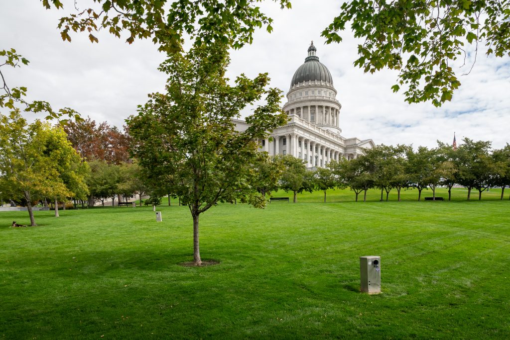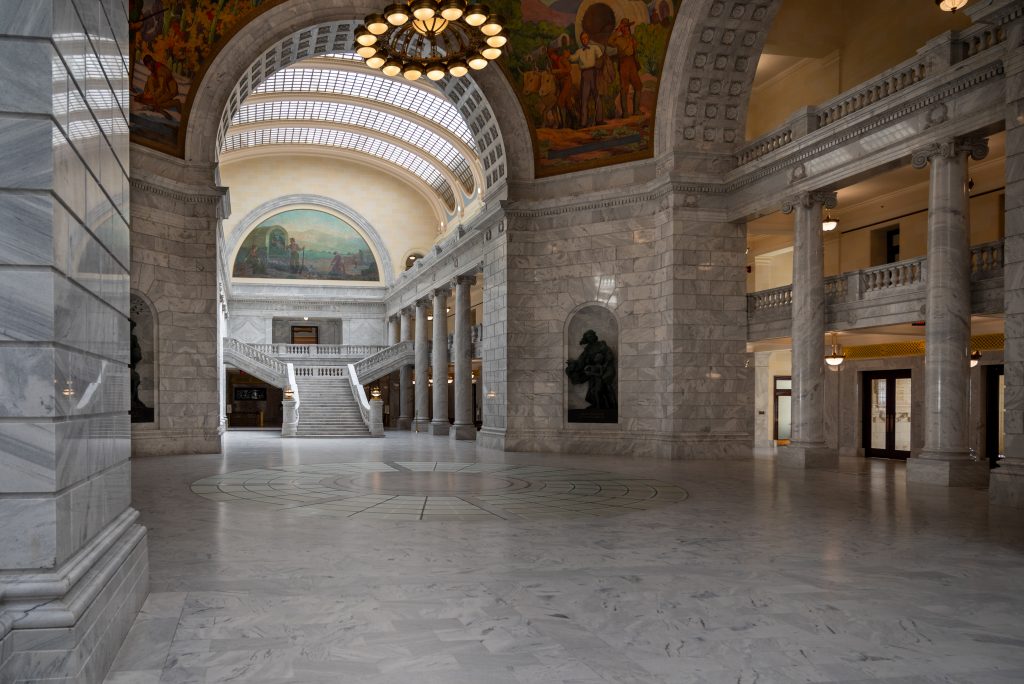 The land on which the city stands rises slowly from south to north. From the edge of the central area at N Temple St the land rises more sharply another 1,000 ft (330 m) to Ensign Peak. On a knoll protruding from the slope is the Utah State Capitol. Mimicking the design of the Capitol building in Washington D.C. it was built in the second decade of the 20th century and its prominence looms over the city. At least it does if you look from State Street northwards. Elsewhere your view is often obstructed by the cluster of sky-scraping buildings downtown. The building itself is readily visited and the grand interior is well worth a wander (https://utahstatecapitol.utah.gov). Look at the marble floors, columns and stairs stretching up to the dome and at the murals of Utah’s history (somewhat idealised and rather sidelining of the period prior to the arrival of Brigham Young and his LDS followers). But also go up to the galleries and look into the rooms of the state’s Supreme Court and Senate and House Chambers and see the many marked doors of the senior offices of the elected representatives. It can seem slightly overpowering and, at a time when I assume the Senate and House were not in session, it has a faintly sepulchral, silent air. Perhaps this is enhanced by the location and the approach up across the pristine, neat surrounding grounds – all wide stone stairs, impossibly green lawns and sparklingly clean memorials of military conflicts. The website proffers self-guided and guided tour options which seem to indicate pre-booking is necessary. I hadn’t. I just walked in at the main eastern entrance and was waved in by the security guards with no-one checking if I had booked. It may be different if the legislature is in session.