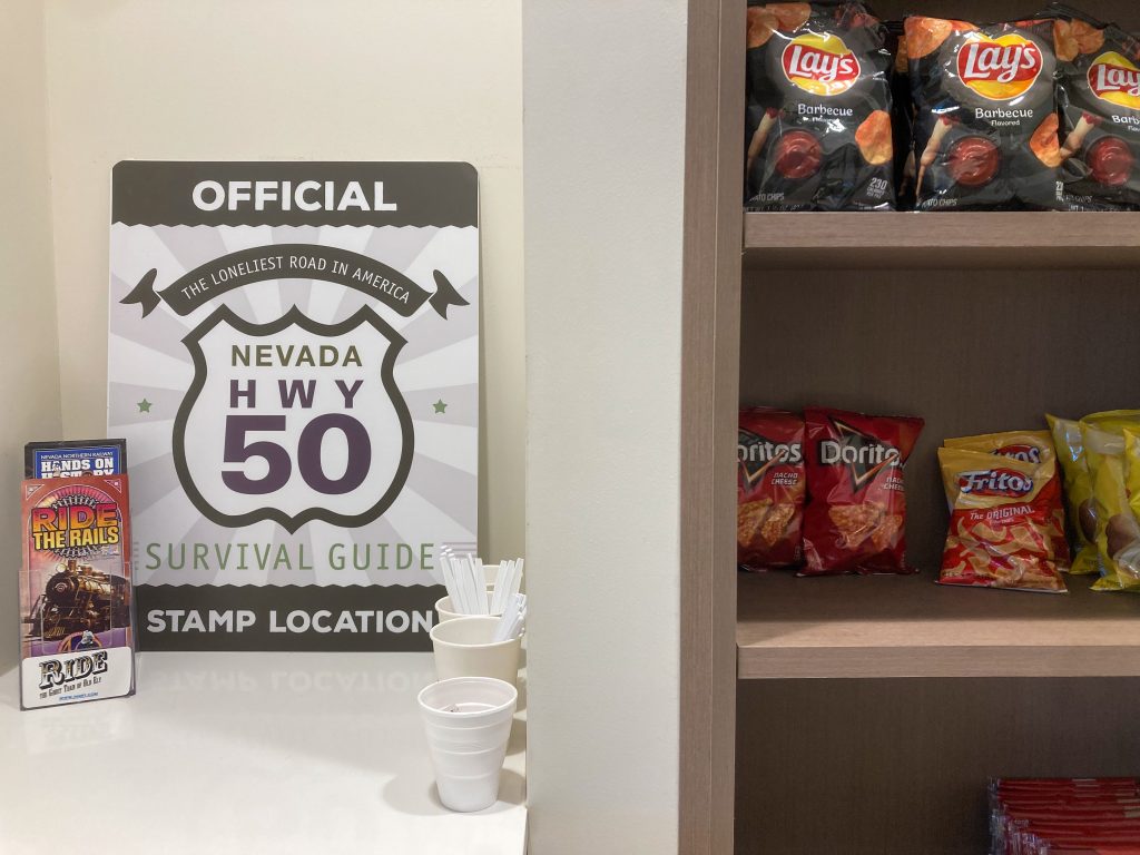 6,300 ft (1,900 m) up in the Egan Range, Ely is suddenly and surprisingly cold. That night the temperature edges down to 48°F/9°C. A grey dampness (we wake to find the clouds lingering around us) adds to a chill feeling we are unused to. Ely is, to us, another of those road towns; all services for passing travellers and locals. Like all towns there is more to it than that (https://elynevada.net) but we cannot stay to ride the steam train of the Nevada Northern or visit nearby Great Basin National Park.