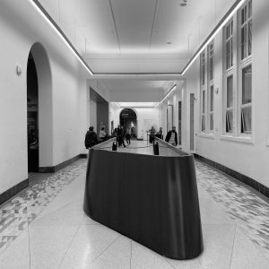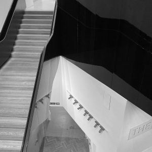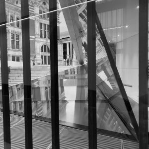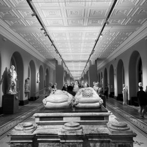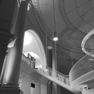 I have an ongoing series of photographs of the interiors of museums and art galleries whose intent is to turn the focus away from the artistic and other exhibited content of a place onto a representation of the space that houses that content. It uses black and white imagery to draw attention further from that expressed raison d’être of the structures to the way designers have chosen to encompass the exhibiting of content and the need to purpose space for the twenty-first century user. This set of images is of the Victoria & Albert Museum in London.