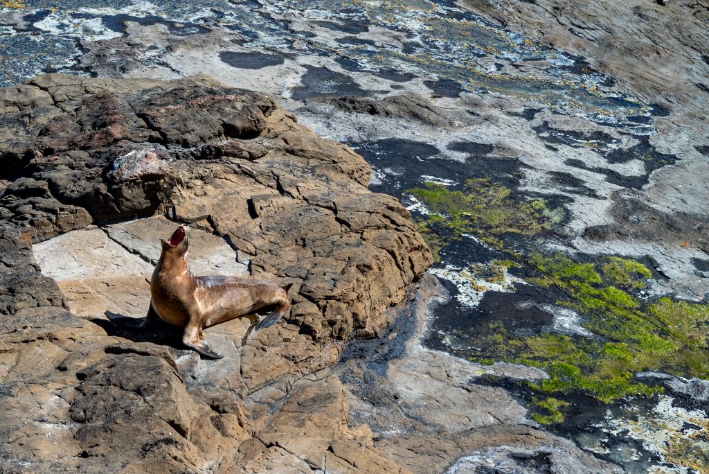 Based in the rolling farmland and forest near Pūrākaunui Falls, we simply used our one day to drive westward through forest and along coast to the open estuary at Fortrose before circling back again ending with a kaleidoscope of visual memories: the overhead sweep of fern trees on the walk up to Pūrākaunui Falls, the stunning views across the coast from Florence Hill Lookout, Maclean Falls in a forest landscape straight out of Peter Jackson’s Lord of the Rings, a solitary sea lion on the empty curve of beach at Porpoise Bay, the estuary at Fortrose with the oystercatchers and the precise, dainty stilts foraging on the mudflats and the extraordinary petrified forest of fossilised tree remains on the rock shelf at Curio Bay. The last of these was enhanced for us by another sea lion settling itself for an afternoon’s basking in the sun on the rock shelf only a few metres below us.