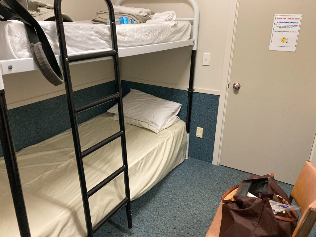 For most of this trip, no problems are presented to those with mobility constraints. The access to, and egress from, the ferry at Manapouri and at West Arm is easy. The ferry has plenty of indoor and outdoor seating. The minibus is accessed right beside the dock. There are plenty of handholds and comfortable saloon seating on the boat. My minor caveats are that the access from the road at Deep Cove down to the boarding point of the boat is quite a steep slope on an uneven path that gets muddy when wet. There are handholds and it is only about 20 metres to the solidity of the dock. The other caveat is that access between the decks is only by a set of the steep ladder steps which you get on many smaller boats. It is the only way to reach your cabin and if you have difficulty with steep stairs, you should make careful enquiries of the team first. The passenger cabins are compact with low ceilings but, on these and on overnighting on the boat, I cannot make a meaningful report because this was not a normal trip.