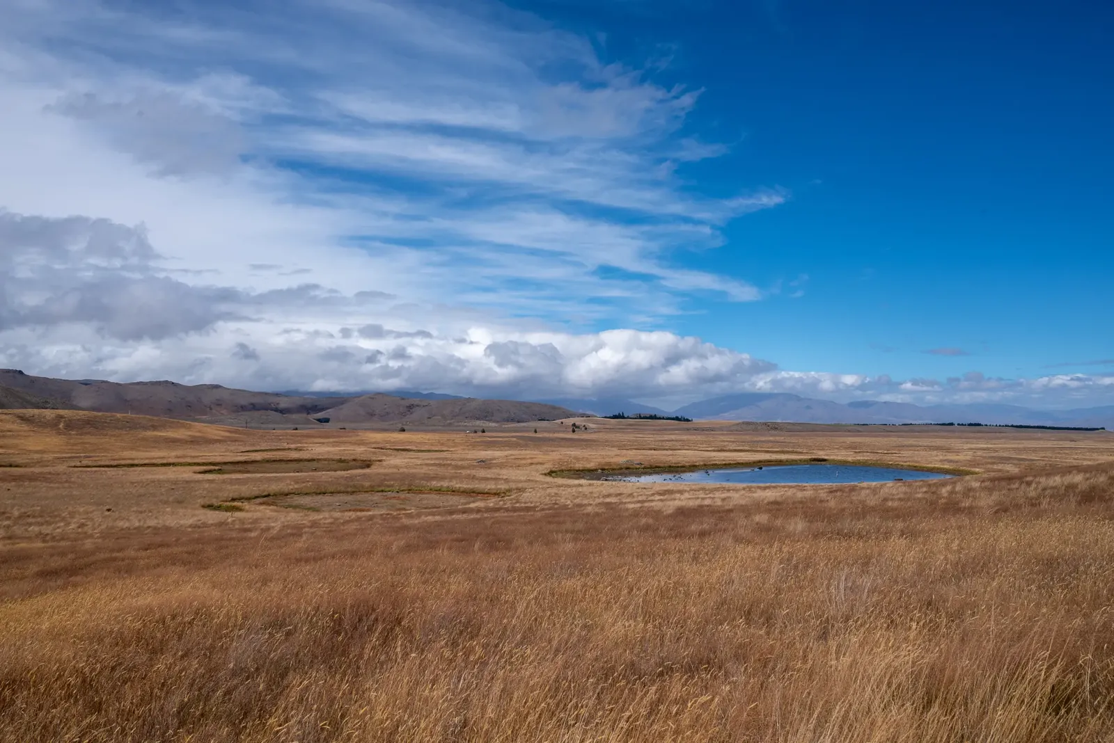 If you do an internet search for walks (not hikes) around Lake Tekapo two that you come up with are Cowans Hill and Pines Beach. By combining them I created a gentle extended walk for myself with a blissfully varied set of landscapes that took me about a leisurely three hours. Starting and finishing in the town precinct, I headed across the footbridge over the outlet from the lake of the Tekapo River where an uneven but manageable path curves round the lakeshore to Pines Beach with reeds, foreshore and herons foregrounding the lake. Then, cutting south across the disc golf course and climbing up through the pine forest, you can cross SH 8 into the open grassland beyond, where a marked track then path takes you up Cowans Hill. Although its summit is at 783 metres (2,360 feet) above sea level, it is only just over 60 metres (nearly 200 feet) above the level of the lake. It is a flat open high point, with 360° views and a resting place for a break, set in a vast swathe of glacial valley grassland that stretches away southwards. In that grassland several small kettle lakes act as stopping points for many migrating geese and ducks. The wind zips briskly over the plateau and the sunlit day is a joy, with encroaching rain clouds on the hills to the east adding to the spare beauty of the scene. The path heads west into a dry pine forest and scrubland tipping down to run along a cliff above the Tekapo River. Here the river is no more than a disconcerting trickle emanating from the barrage that takes SH 8, and me, back into the town precinct. I saw not another soul for most of the walk, giving me the thought that this was another of those unsung activities that really brought the quality of the South Island to the fore.