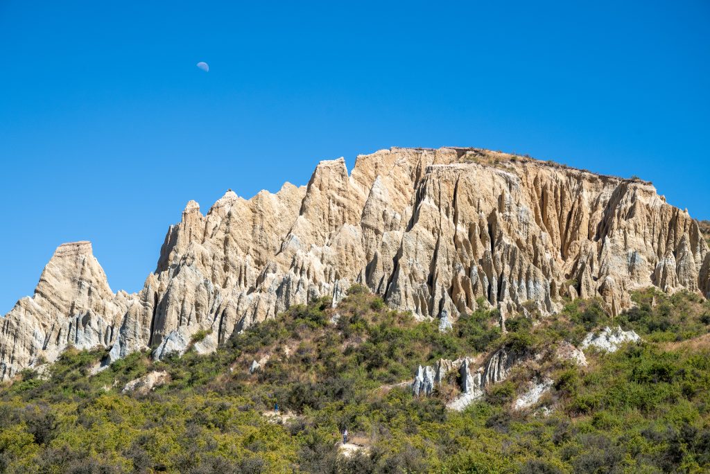 The road to Lake Tekapo was only a 120 kilometre (75 mile) drive from The Lindis but was punctuated by three, completely different, wow-inducing sights. The first was the clay cliffs near the town of Omarama. Heading north on SH 8, these bizarre clay rock formations are glimpsed off the west as you approach the town. Reaching the car park that serves the cliffs involves going through town and driving west then south west, the last section on an unsealed road that leads only to the car park. To me, cliffs are a bit of a misnomer for these strange formations look, but for their light brown clay colour, somewhat like stalagmites that have escaped their underground cave. From the car park a wide packed gravel path leads 400 metres up a gentle slope to the heart of the rock formations. There is an honesty box for paying for car parking on the road up to the cliffs.