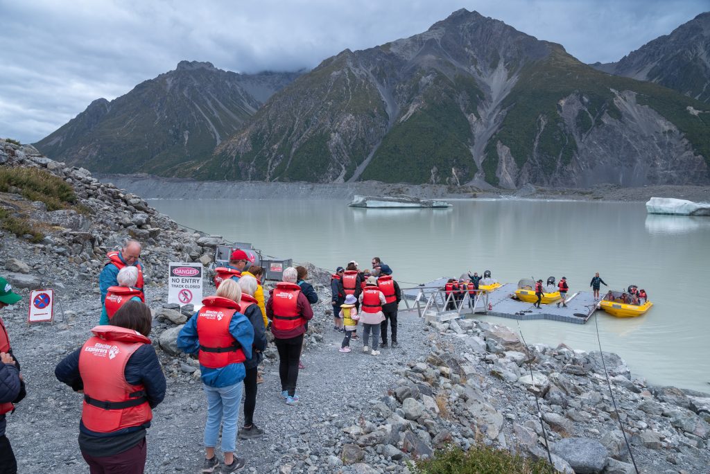 This glacial lagoon boat tour (https://www.hermitage.co.nz/experience/glacier-explorers/) was pre-booked by our travel advisers. The lagoon is a creature of the climate-affected Tasman Glacier and sits a short drive away from Mount Cook Village, de facto a centre for winter sports and summer hiking and mountaineering. The tour meets at the village’s main hotel, The Hermitage. Set higher up the mountain above the main part of the village, the hotel offers a café and restaurant and, in the foyer area, the Sir Edmund Hilary Museum. All of which means the non-touring guests can rest and take their ease whilst taking in the wow rated views of Mount Cook, the Hooker Valley and the fascinating glacial plain that spreads out from the towering mountains. Parts of the valley floor look more barren than I expected, brown and sandy. A later, closer sight shows what I thought was sand is actually brown plant life, a colder climate moss or some such.