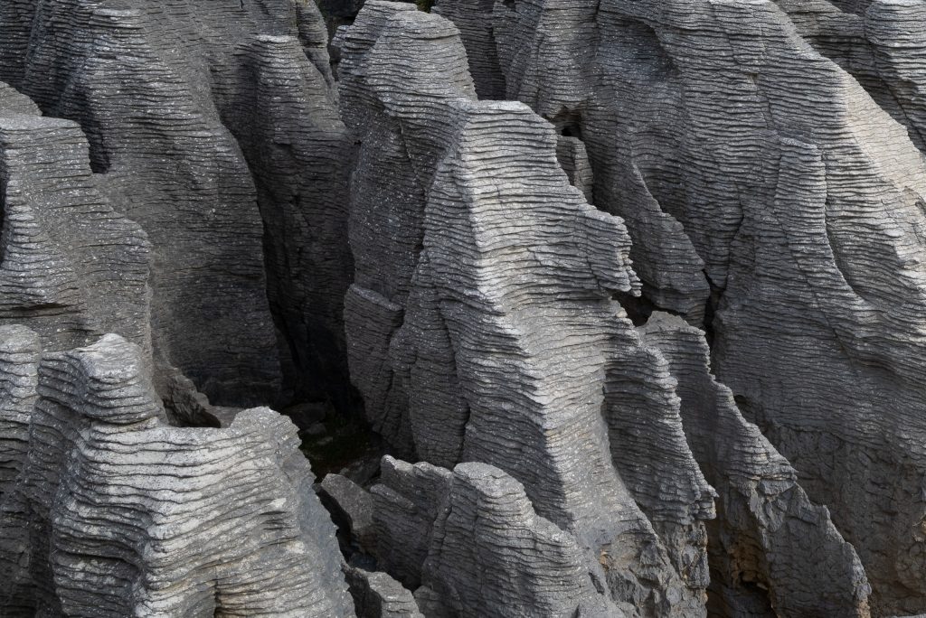 Then back to Greymouth and a further 45 minutes’ drive up the coast to the truly odd-looking geological formation of Pancake Rocks and our overnight stop. We were drawn here by those rocks but it also felt as if we had dropped into a land of lush, almost tropical vegetation. We knew that it rains far more on New Zealand’s West Coast but had not equated that with the outcome that we were now in a temperate rain forest climate. It made for another absorbing change in the scenery with ferns and big leaved plants clinging to the high cliffs that sit alongside SH 6 as it follows the shore. Pancake Rocks, and its associated settlement of Punakaiki, are squeezed between cliff and sea and are the centre for visiting Paparoa National Park, an area of rain forest offering yet more hiking for those so inclined. Clearly we are not, so it is to Pancake Rocks we go. It is impossible to describe this formation of smoothed, striated rocks worn by the sea into pillars, arches and folds. It is part of the National Park managed by the Department of Conservation (https://www.doc.govt.nz/parks-and-recreation/places-to-go/west-coast/places/paparoa-national-park/things-to-do/tracks/pancake-rocks-and-blowholes-walk/). There is a 1.1 kilometre tarmac path, smooth and properly finished, that circles through to the rocks through a shrubland of flax and ferns.