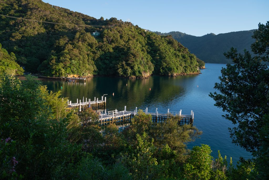 Reachable only by water (unless you are prepared to come in by helicopter or hike many kilometres along the Queen Charlotte Walking Track and scramble down through the woods to the bay shore), this is a true resort focused on waterborne and walking activities and providing quality food and service (https://www.bayofmanycoves.co.nz). Cougar Line provides a daily passenger ferry service to the resorts and other docks along Queen Charlotte Sound. Their motorised catamarans have cabins with seating and an outside well at the stern. They run five trips a day and scoot you across the 30 or so kilometres of water to the resort in about 45 minutes – see https://www.cougarline.co.nz/timetable/. If the weather turns squally (as it did on our return trip) it can be a bit bumpy.
