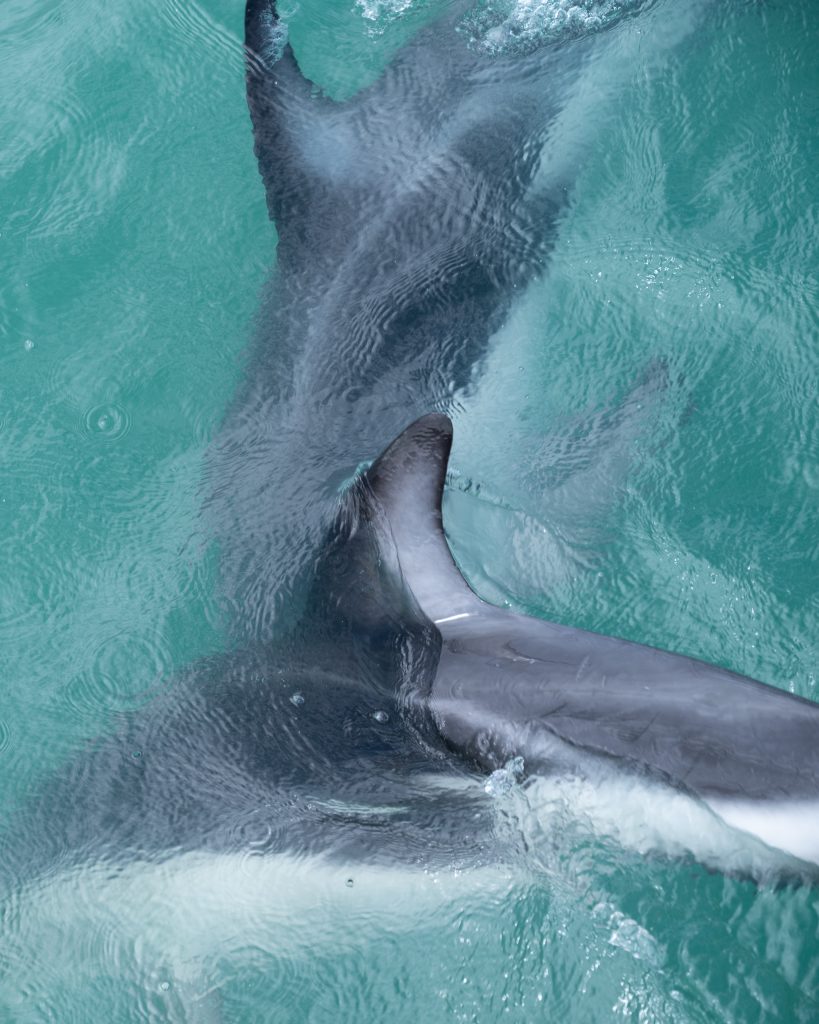 The Dolphin Encounter website has a wealth of information in the FAQ section but a couple of other thoughts came to me. First there is the question as to whether swimming with wild dolphins is ethical. I assume there will be differing views on this but, unlike swimming with captive dolphins which is a complete no-no, this sort of activity seems to depend a great deal on the attitude of the company running the tour and the dolphins being swum amongst. The dusky dolphins here in Gooch Bay are regarded as a sub-species that seem to be unaffected by the activity and you are given clear no touch instructions at the outset. As to Dolphin Encounter I was reassured to find positive references to the company in several articles on the subject, for example https://littlelosttravel.com/is-swimming-with-dolphins-ethical/. Secondly there is the possibility of difficulty with underwater visibility. The squally, wet weather seemed to have churned up the ocean to such an extent that, peering through my mask underwater, I felt I could not see anything more than an arm’s length in front of me. So, although I was swimming in the heart of the pod, I could only see the dolphins’ interactions when I was above the water. Judging from the many photographs online, on days of better weather the water is much clearer. It is difficult to know what you can do about this as the tours get booked up weeks in advance, so best just to go with the flow and, whatever the visibility, enjoy just being in the sea amongst these inquisitive creatures.