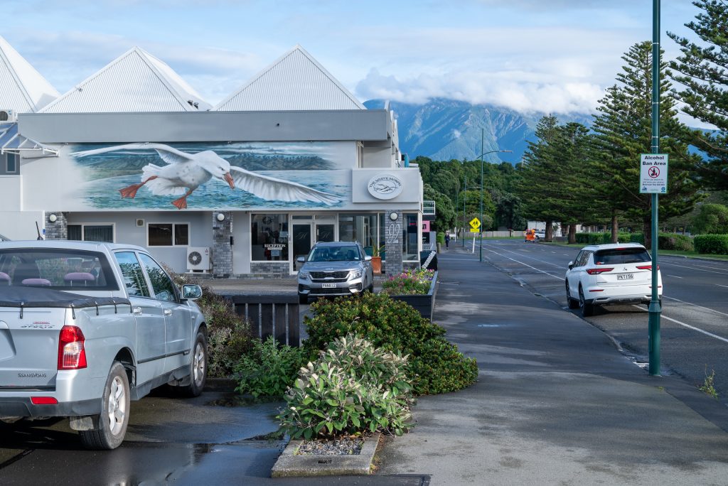 Then Kaikōura, another town built around outdoor activities and tourism. Like a number of conurbations along the eastern coast, this town is another tucked into the north side of a peninsula with a long stretch of grey gravel-sand beach leading into the rising hump of hills of that peninsula. Approached from the north the main road is a strip of holiday accommodation, camping sites, retail park-style stores and local services from agricultural supplies to nail bars. Off the main road the small town centre is a mix of single storey buildings with retail stores and eating places. Then the seafront esplanade curls round the bay, tree-lined and with residences and businesses that are further evidence of the town’s tourist-focused pedigree. The up and down weather continued: sun and squally rain interspersed.