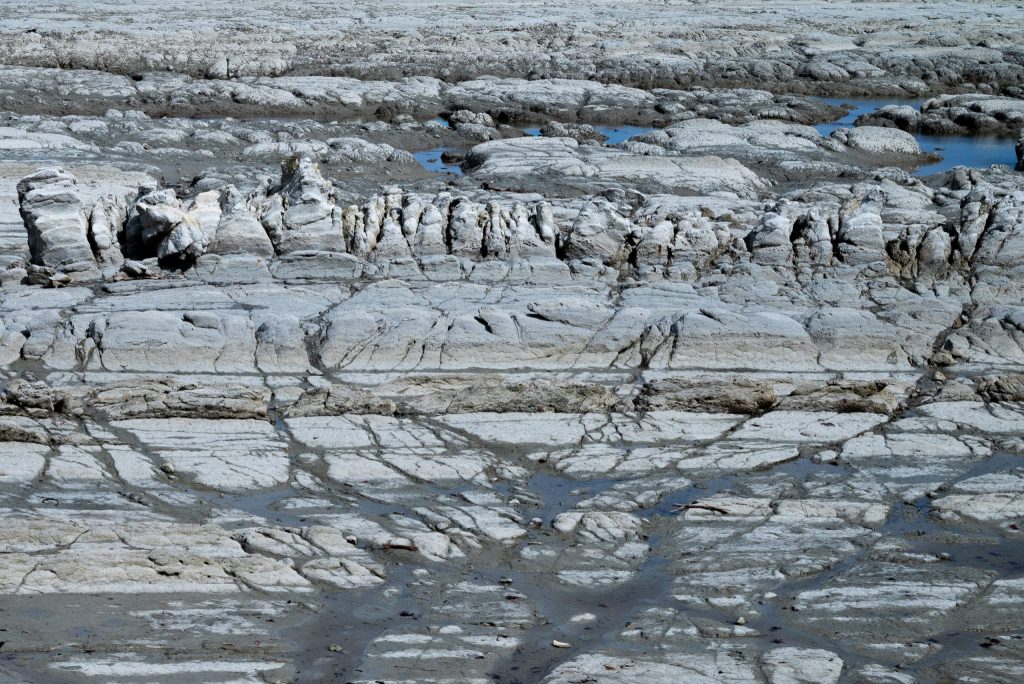 The Kaikōura Peninsula is much smaller than its relatives further south that shelter Christchurch and Dunedin, so the two Recreation Reserves there are readily accessible. A well-marked, 3.3 kilometre (2 mile) walk around the head of the peninsula (the Kaikoura Peninsula Walkway) links the two. The totality has its own pdf pamphlet from the Department of Conservation (https://www.doc.govt.nz/globalassets/documents/parks-and-recreation/tracks-and-walks/nelson-marlborough/kaikoura-peninsula-brochure.pdf). From both Reserves you can see the large rock shelves with their surfaces gouged by long straight furrows. They are a good place to spot basking seals. We visited Kaikōura Recreation Reserve at the north end of the peninsula where a car park marks the end of the road. There is room to walk on the flat, tarmac surfaces along the esplanade back towards town. There are a few steps down to the rock shelf but its flatness is deceptive with a knobbed, cracked surface pockmarked by low depressions that capture pools of water as the tide retreats. On the other side of the peninsula is South Bay Reserve where, at the far end of another end-of-road car park, a Māori-design sculptural arch marks the entrance to the walkway around the bay with its own rock shelf and attendant birdlife. The walkway here is a combination of boardwalk and tarmac path before it heads up the hill to the path around the headland.